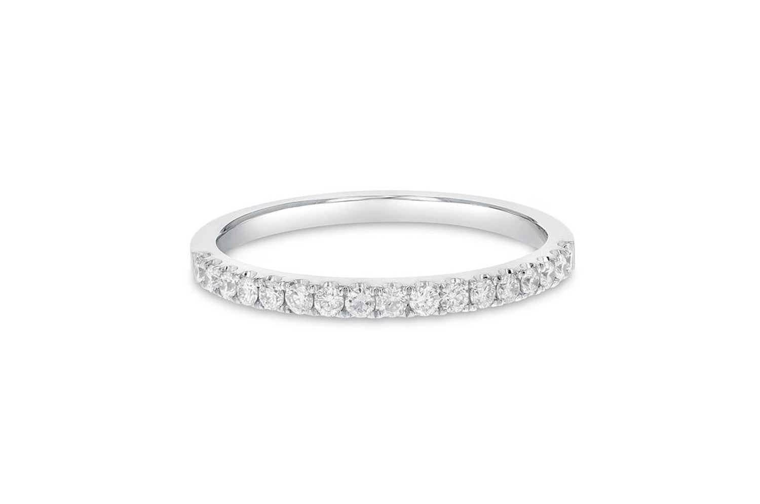 This diamond wedding band features natural diamonds set in 18k white gold. Weighing a total of 0.47 carats. Perfect wedding band or stackable ring.