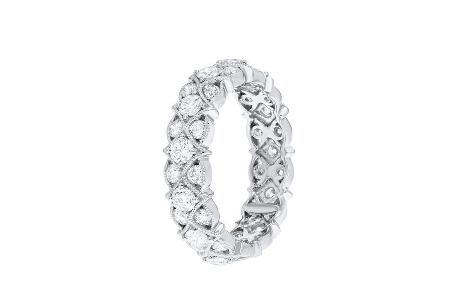 This diamond wedding band features natural diamonds set in 18k white gold. Weighing a total of 1.94 carats. Perfect wedding band or stackable ring.