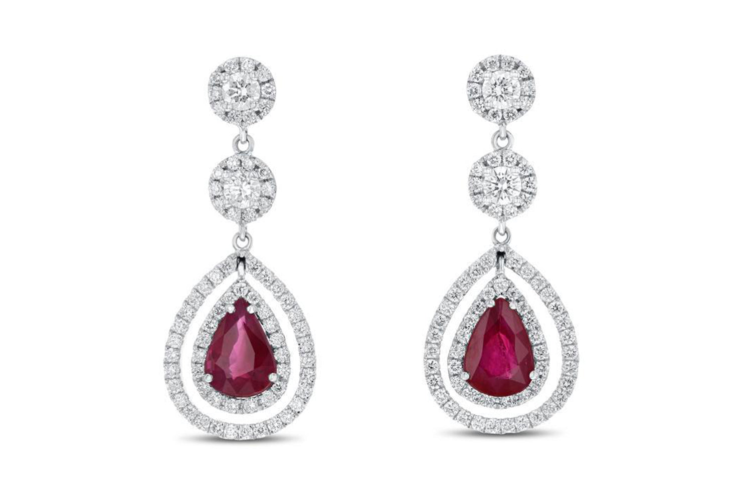 These diamond and gem earrings feature natural rubies set in 18k white gold. Weighing a total of 3.26 carats. These VS clarity rubies are sure to have excellent brilliance!