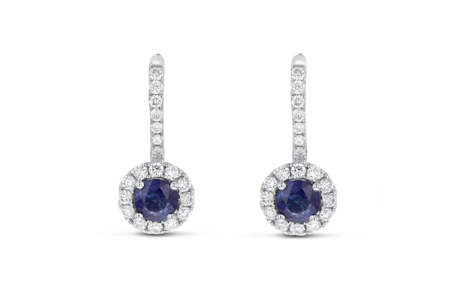 These diamond and gem earrings feature natural sapphires set in 18k white gold. Weighing a total of 1.21 carats.