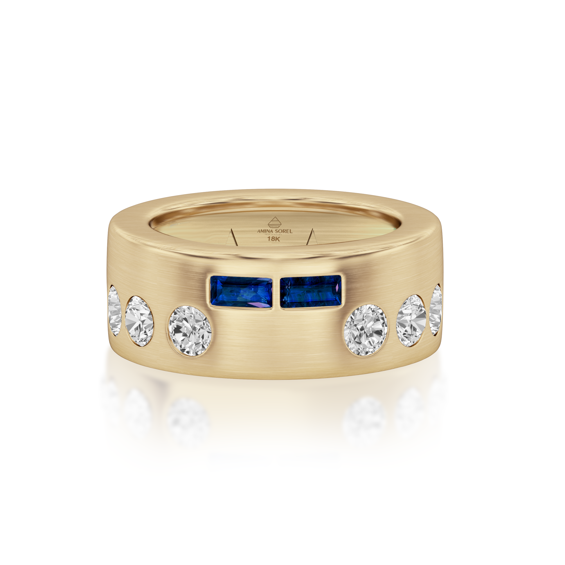 Handcrafted in New York City featuring 2.52ct Diamonds and .60cttw London Blue Sapphire & the mantra of "Inspire" written in Morse Code. Showcasing round brilliant and baguettes G-H/SI diamonds, all set in Fairmind 18k gold. Notice our signature star gallery inlay making this ring secure and comfortable. *All rings resizable*